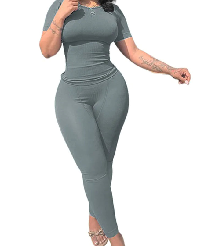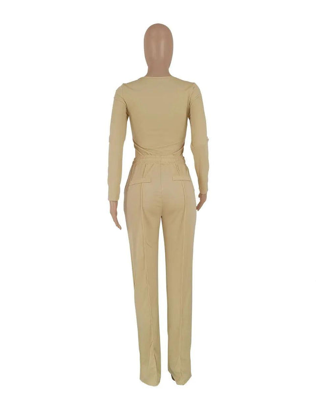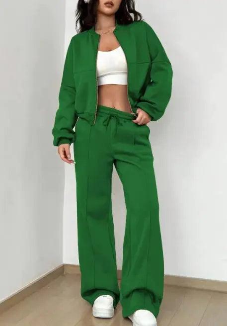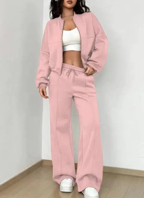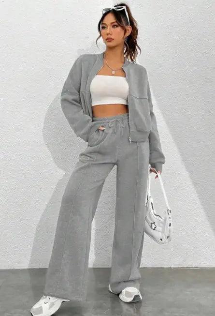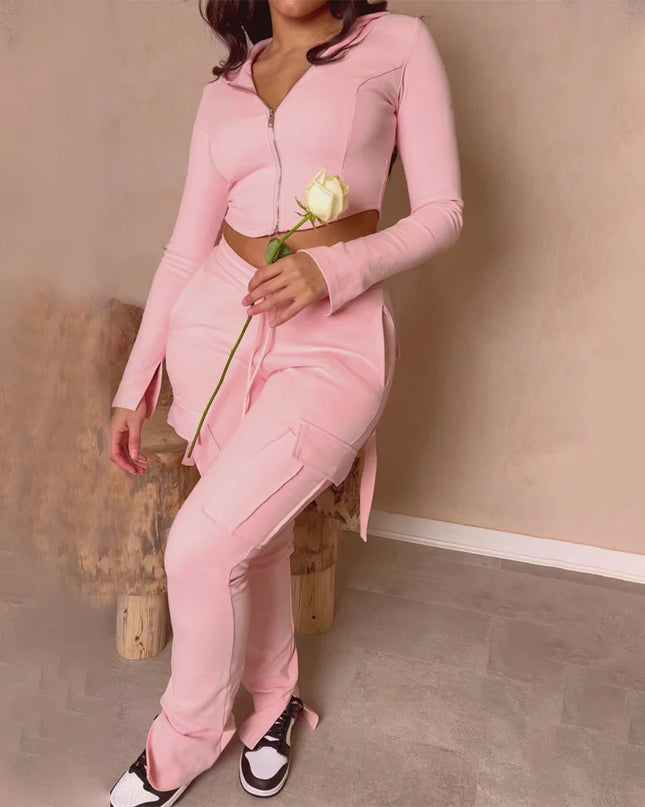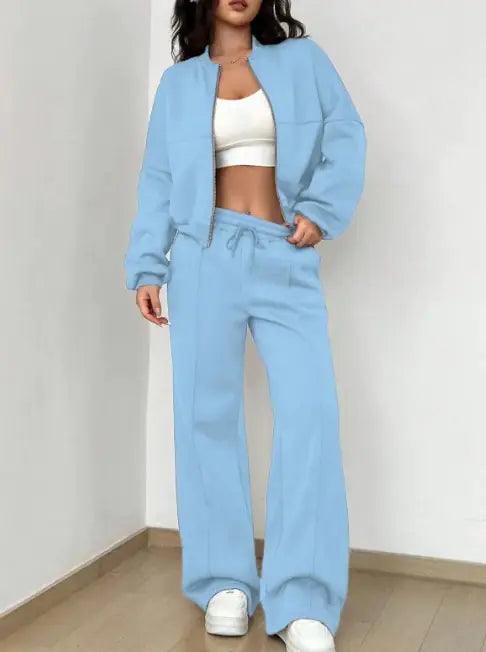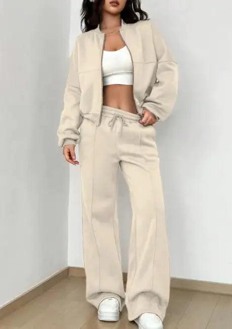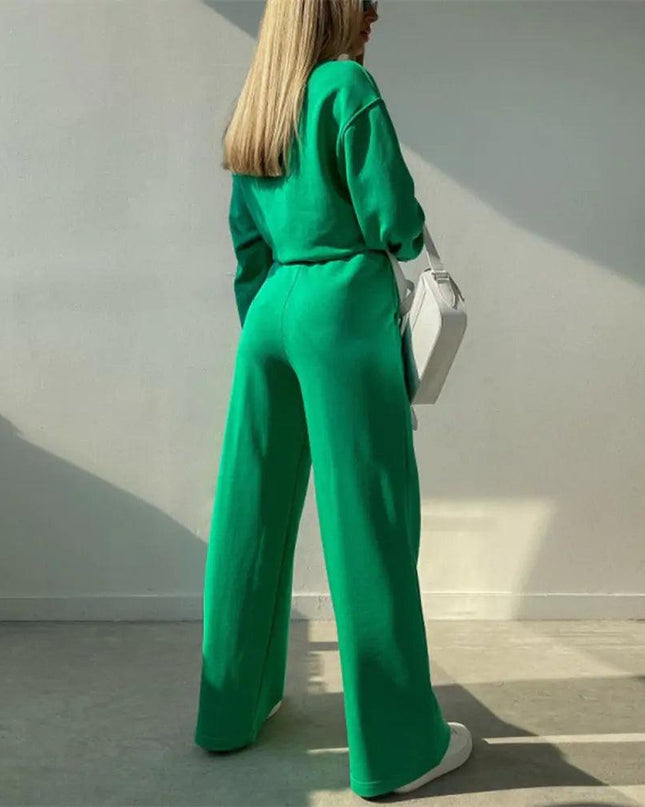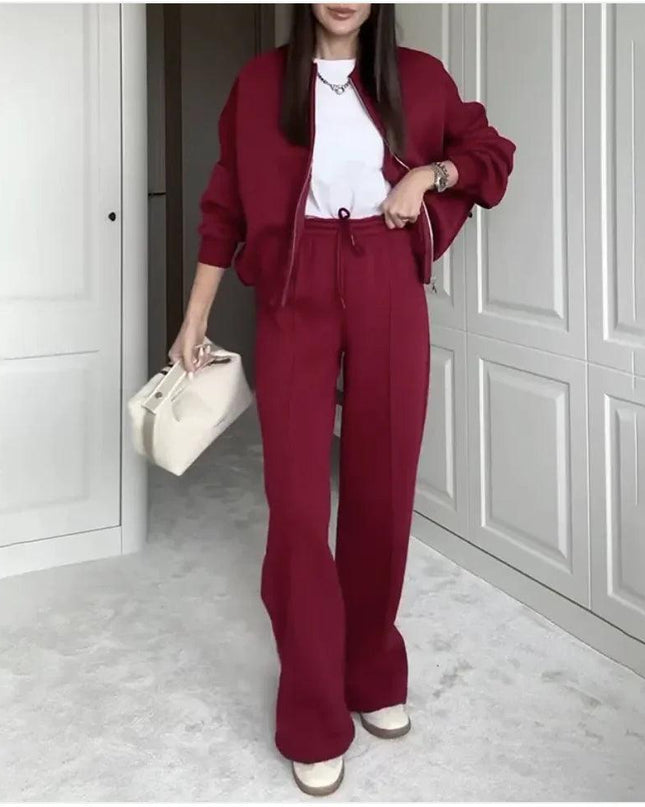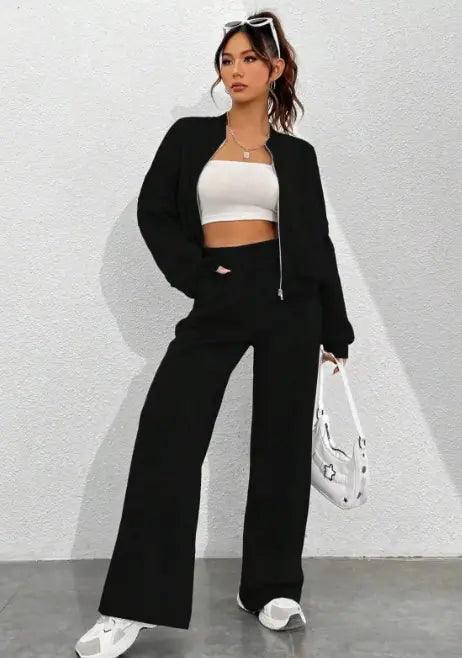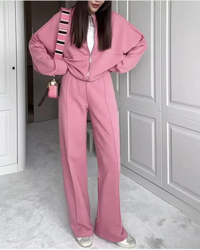 Solid Color Zip-Up Sweater and Casual Trousers Set