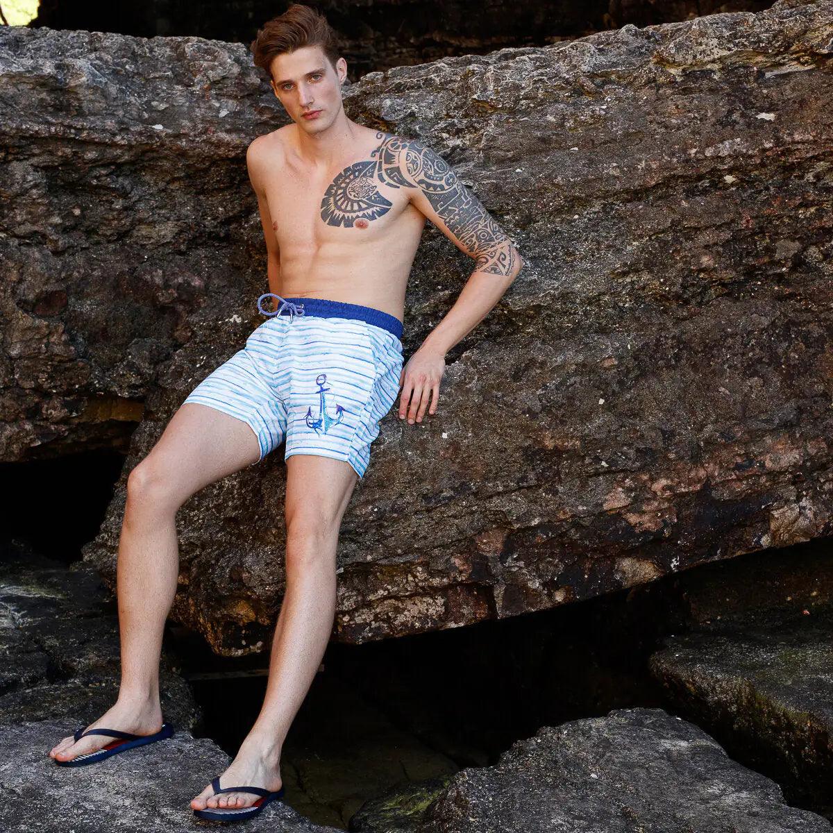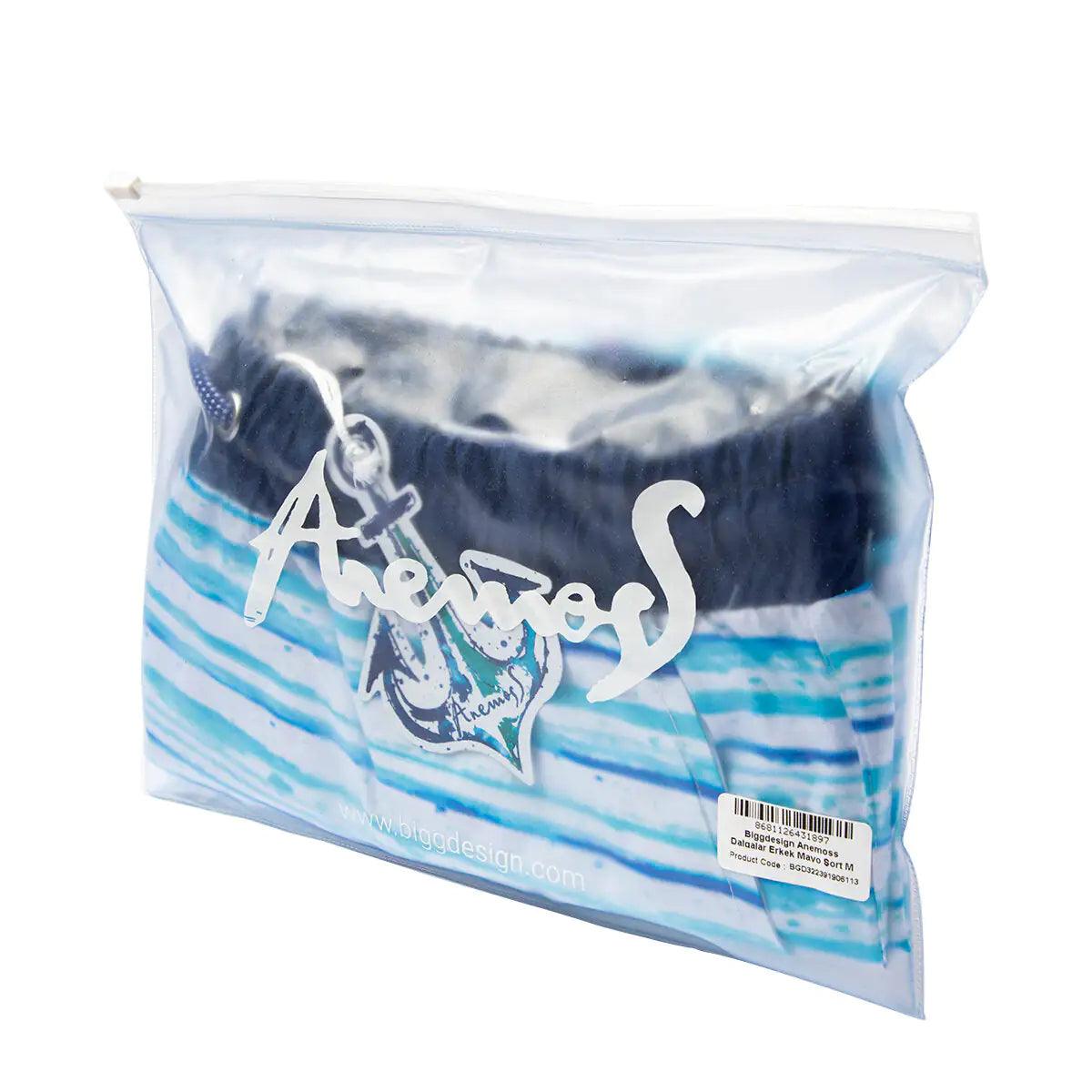 Anemoss Waves Men Swim Trunk is made of 100% polyester. This mens swimsuit has an elastic waistband with a drawstring...