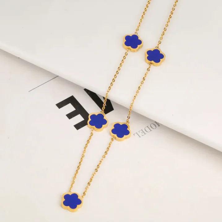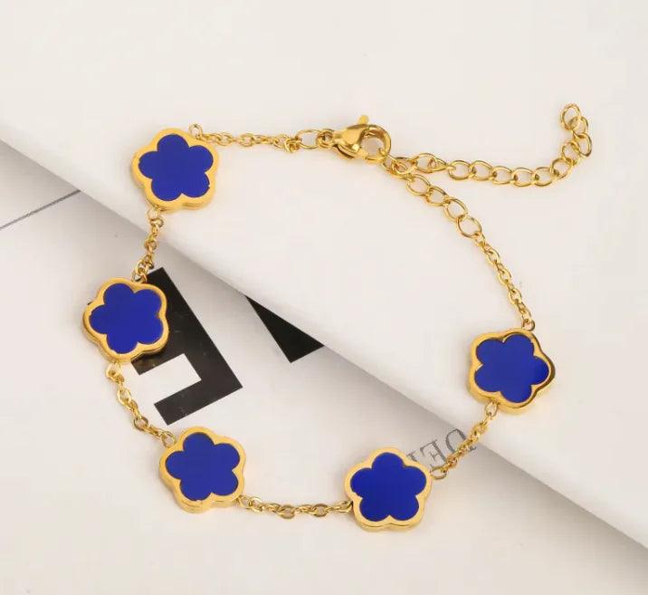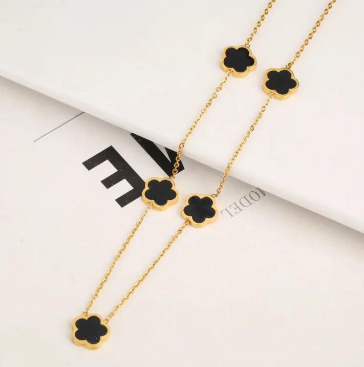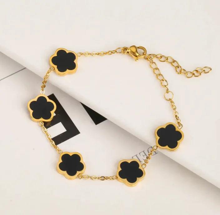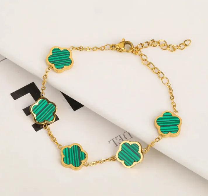 The Stainless Steel Plant Fritillary Five Leaf Petals Jewelry Set is a stunning three-piece collection featuring earrings, a bracelet, and...