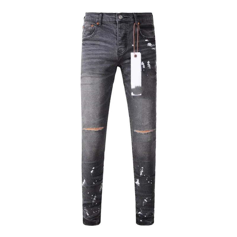 Embrace edgy style with these cool gray jeans featuring dramatic knife-ripped details and a unique splash ink design. The ripped...