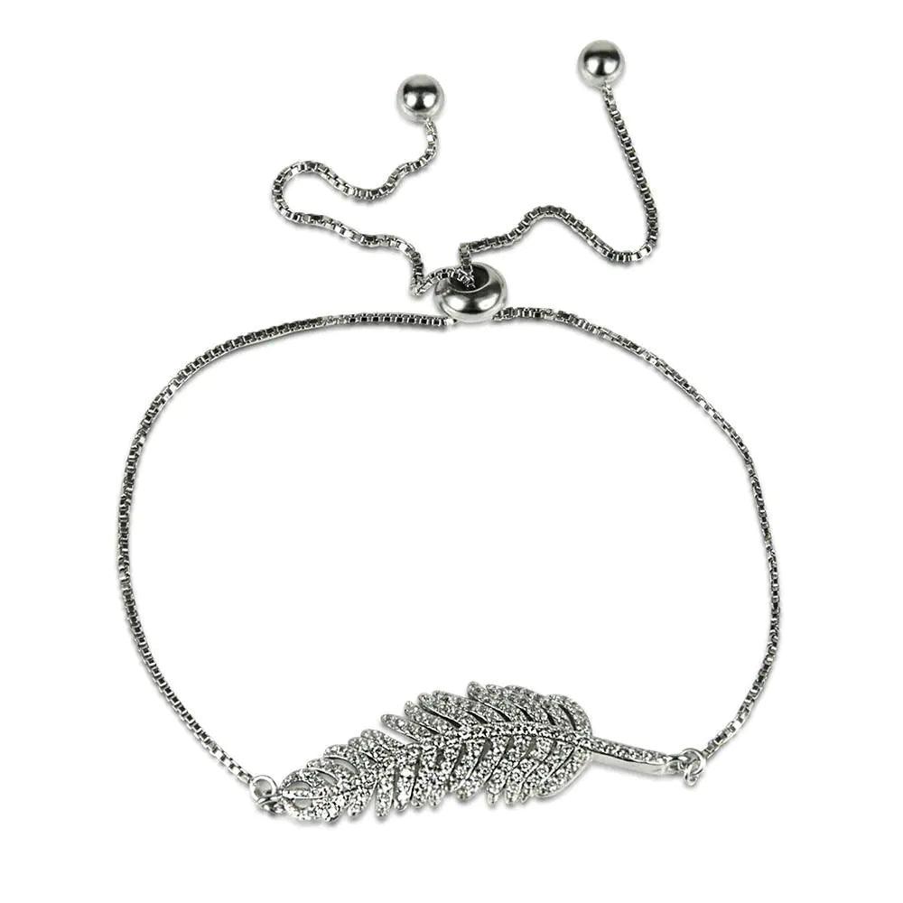 Sleek stainless steel bracelet with a CZ crystals delicate leaf that sits right where you want it because the length...