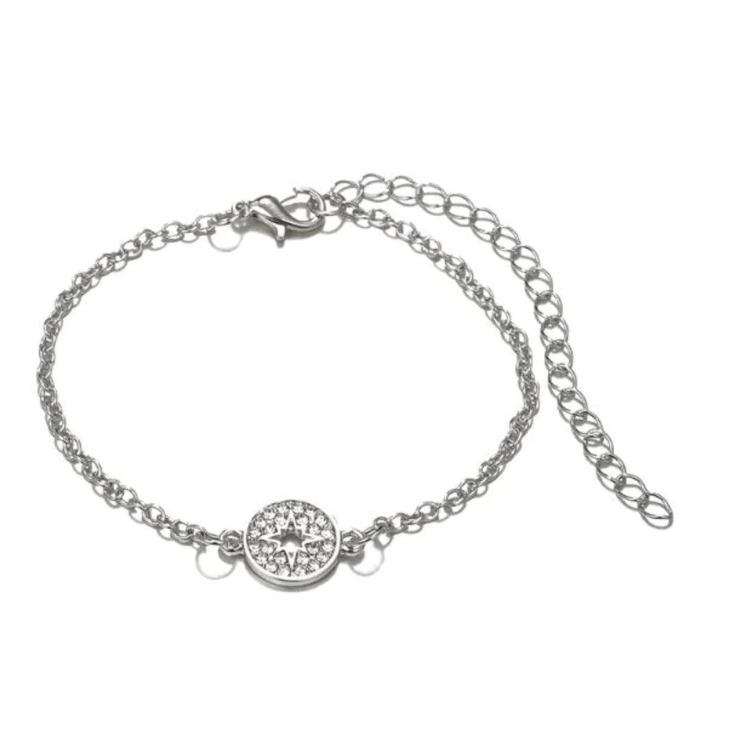 Silverplated chain bracelet with a round rhinestone filled centerpiece. Perfect for stacking! Length: 7"+ 2.5" extender