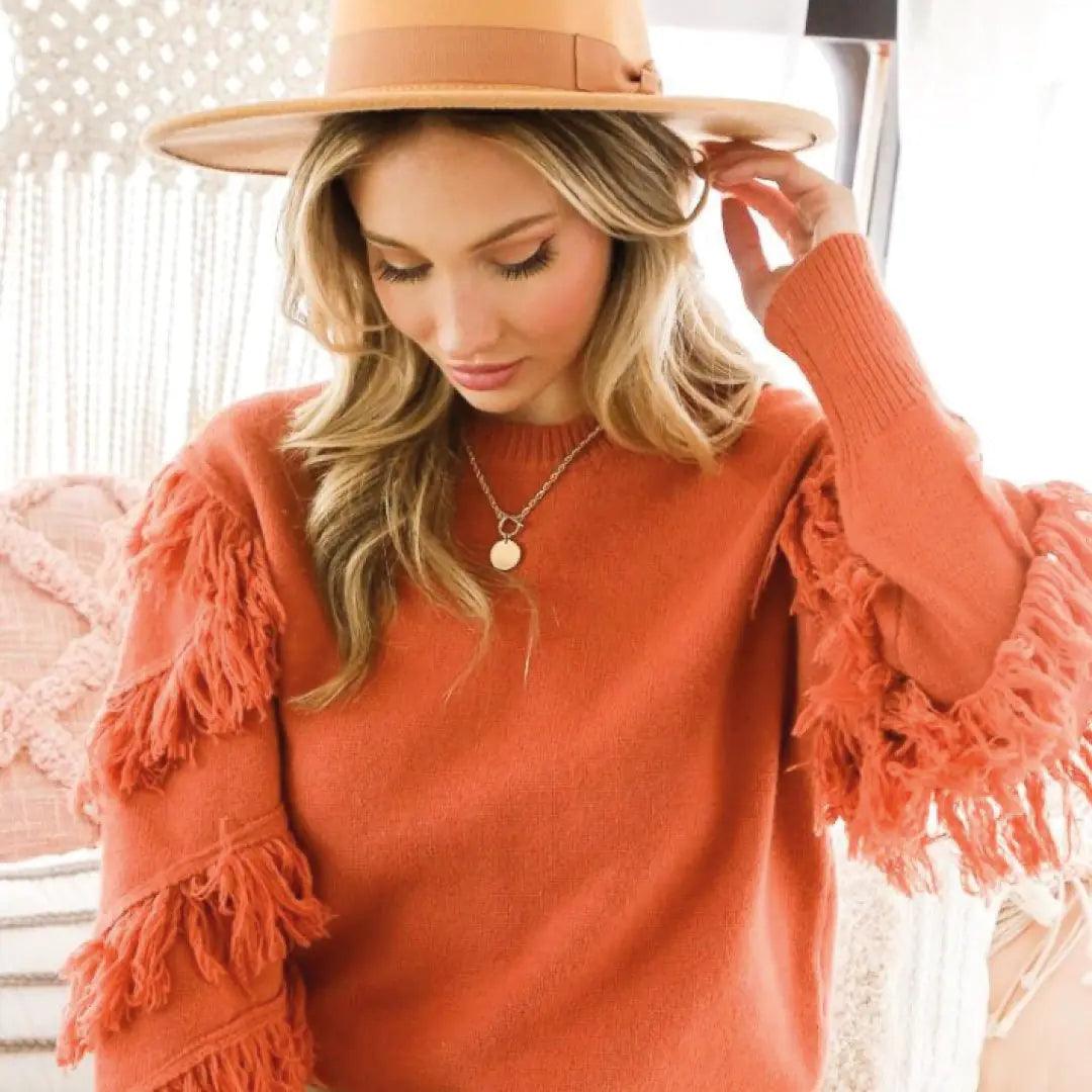 Round neck, soft, knitted sweater with diagonal tassel detail on sleeves.
